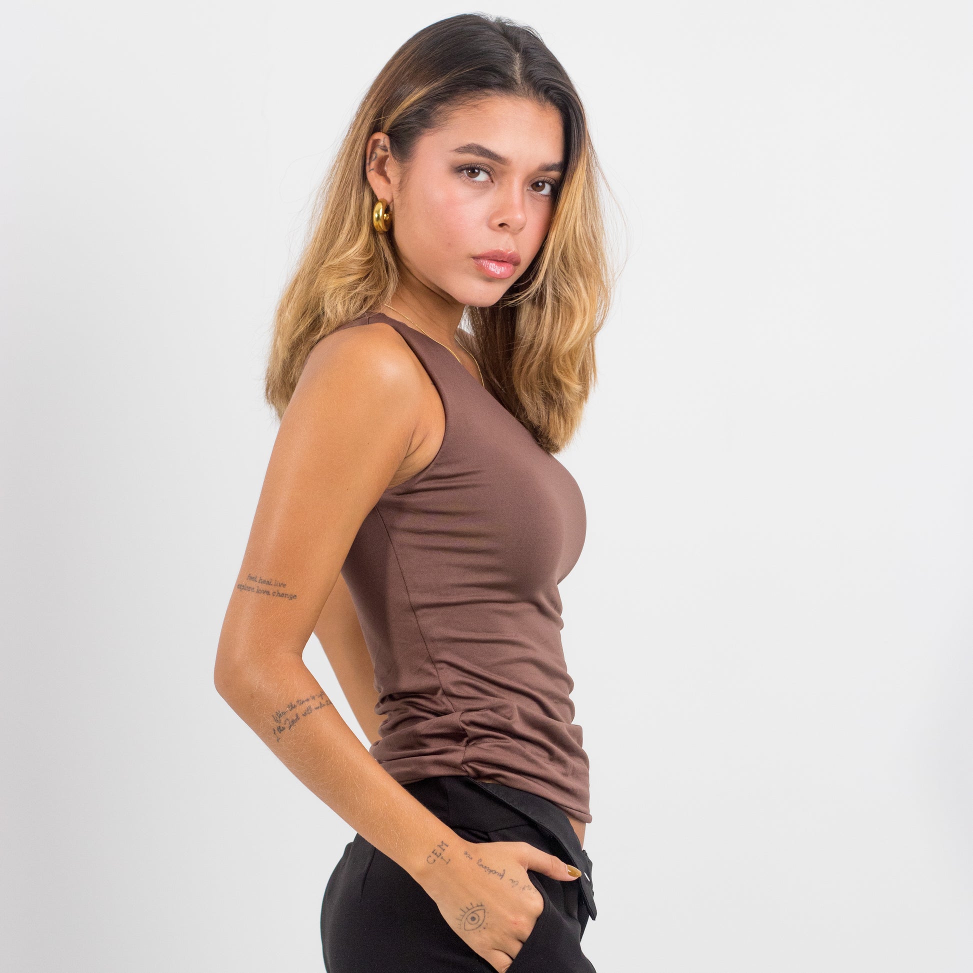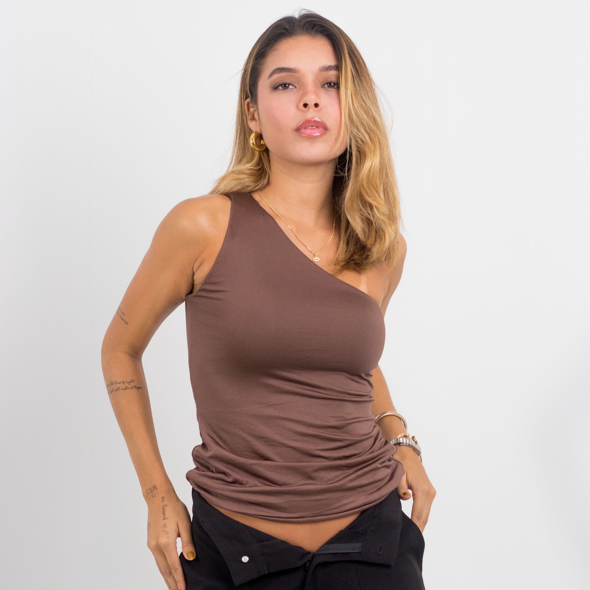 - Top de un solo hombro, largo hasta debajo del ombligo
